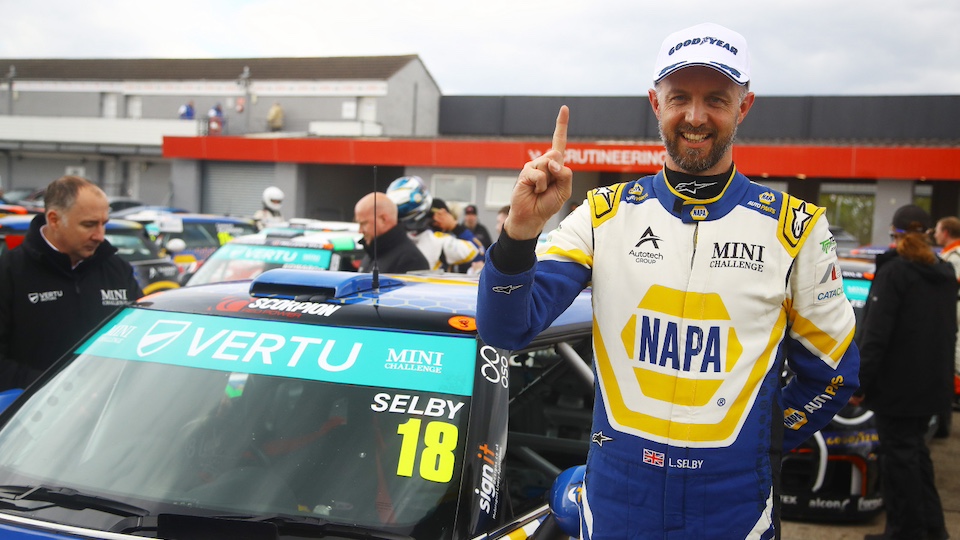 Lewis Selby made a gamble on slick tyres pay off in astonishing fashion to secure a maiden victory in the Vertu MINI CHALLENGE at Donington Park.