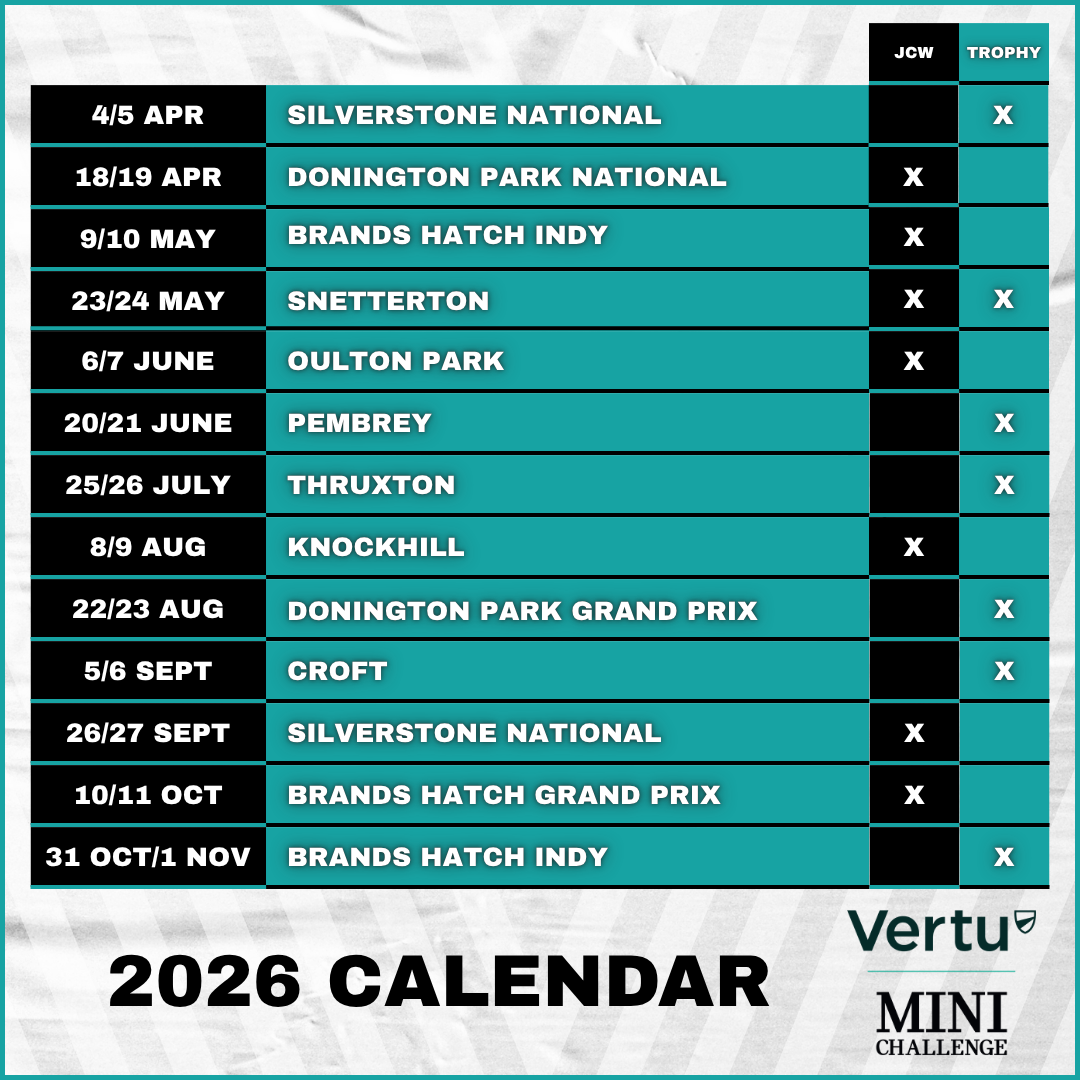 A British Touring Car Championship support meeting including all three classes of the Vertu MINI CHALLENGE is the highlight of a 13-date calendar that can today be confirmed for the 2026 season.