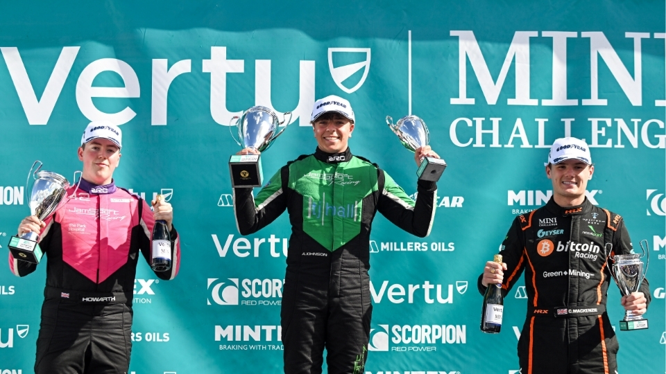 Archie Johnson will lead the JCW Sport field into the final rounds of the Vertu MINI CHALLENGE after wrapping up three wins from three in the final race of the weekend at Silverstone.